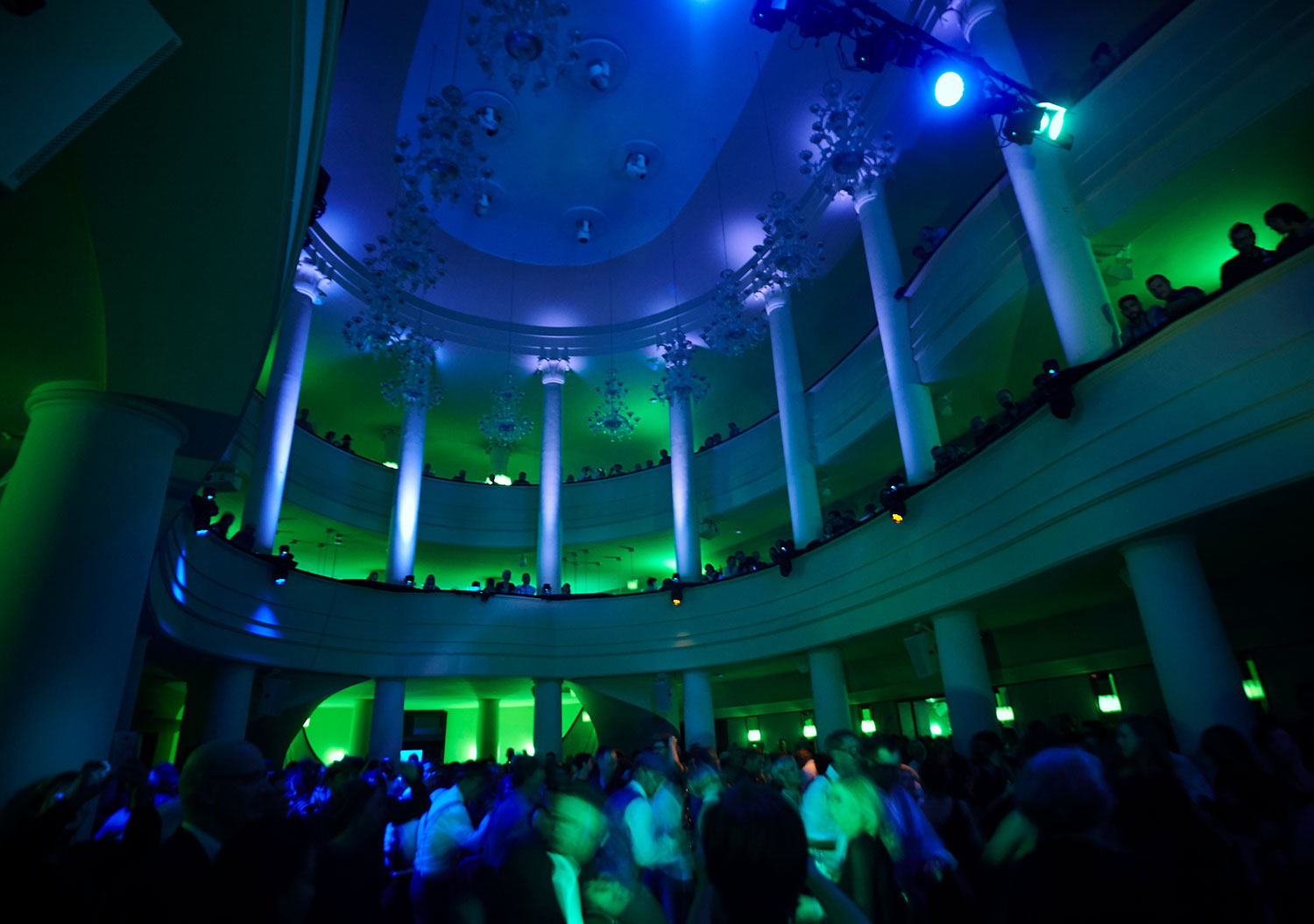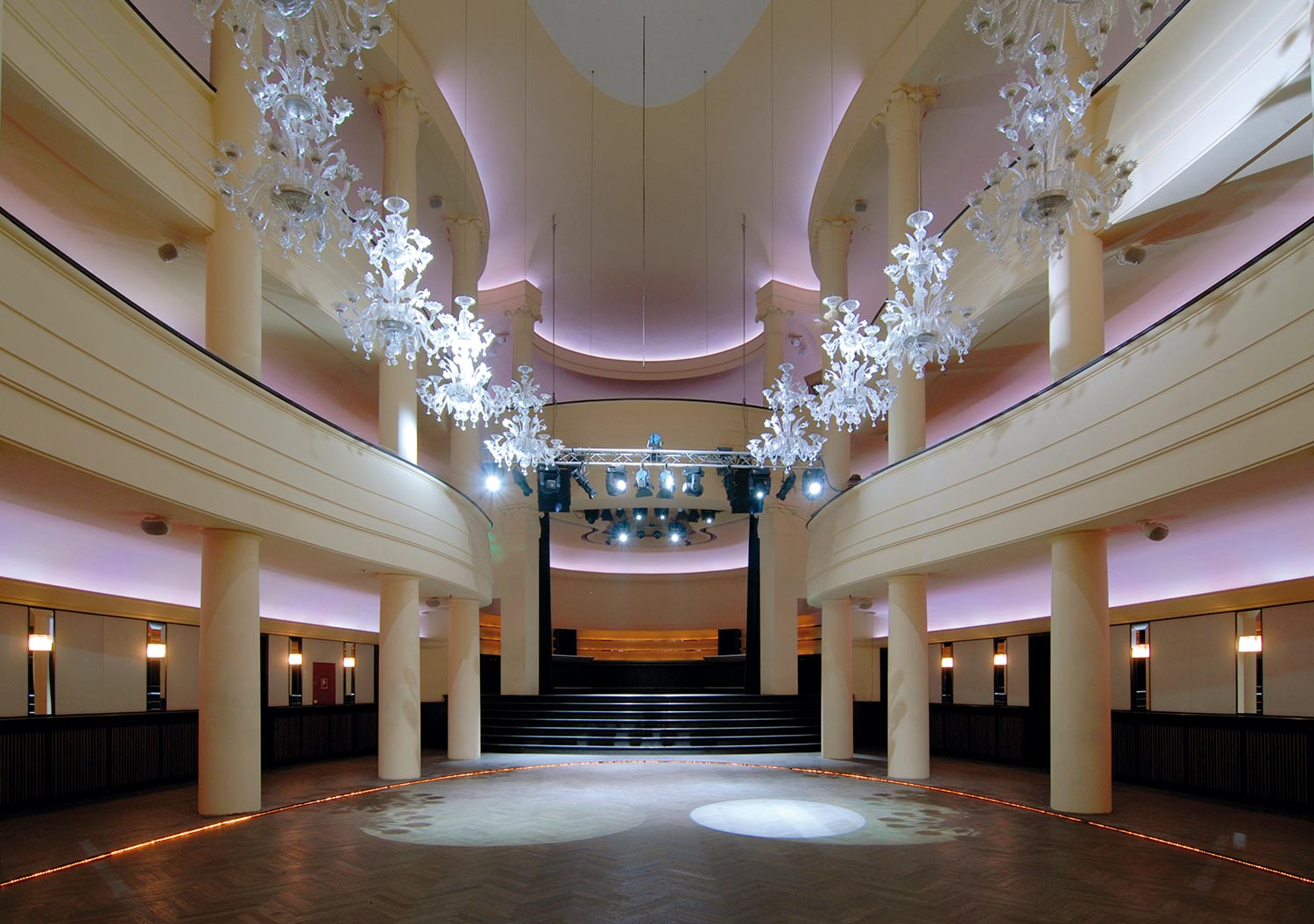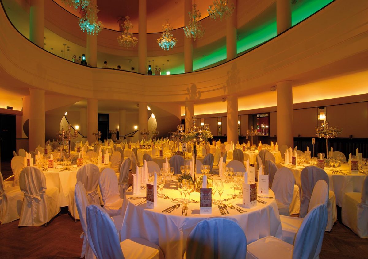 Nachdem Sie sich ihrer Garderobe entledigt haben, gelangen sie über eine der zwei großzügig geschwungenen Treppen in den Hauptsaal.