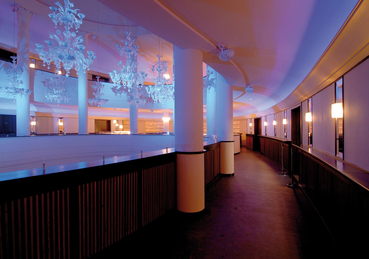 Der einzige offensichtliche Pomp, den sich dieser noble und doch unprätentiöse Raum leistet, sind die beweglichen Kronleuchter aus feinstem Muranoglas unter der 14m