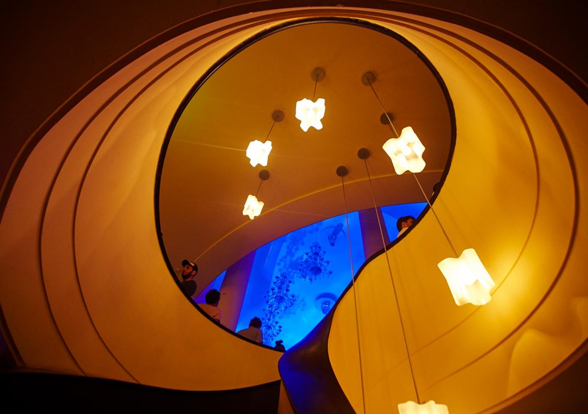 Der 300m² große Hauptsaal strahlt einen ganz besonderen Charme aus. Er besticht durch die organischen Formen, das warme, dunkle Holz, das beigefarbene Nappaleder an den Wänden und die zwölf stattlichen Säulen. Das sanfte indirekte Licht aus hochmodernen Leds, die jede nur denkbare Lichtstimmung erzeugen können,