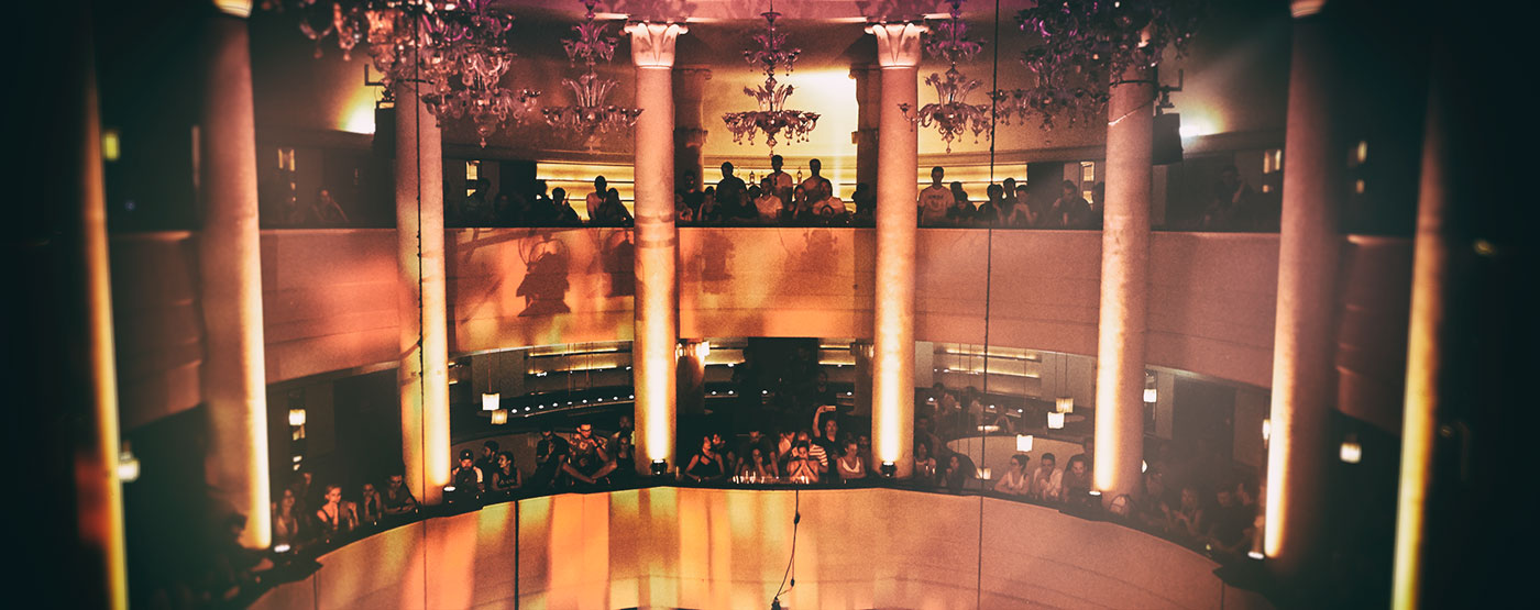 Von der 2. EMPORE aus erreichen Sie das 3. Séparée – die frühere Kaiserloge. Als „Location in der Location“ verfügt es über ein separates Treppenhaus und ist so auch unabhängig von laufenden Veranstaltungen im Haus nutzbar. Über der ehemaligen Kaiserloge schwebt noch heute ein feiner Hauch royaler Noblesse. Die verzierte Stuckkassettendecke in 9 m Höhe und eine 8 m hohe Glasfront in Richtung Nollendorfplatz zaubern in dem lichtdurchfluteten Raum eine einmalige Atmosphäre zum dinieren, netzwerken, vortragen, tanzen und genießen.